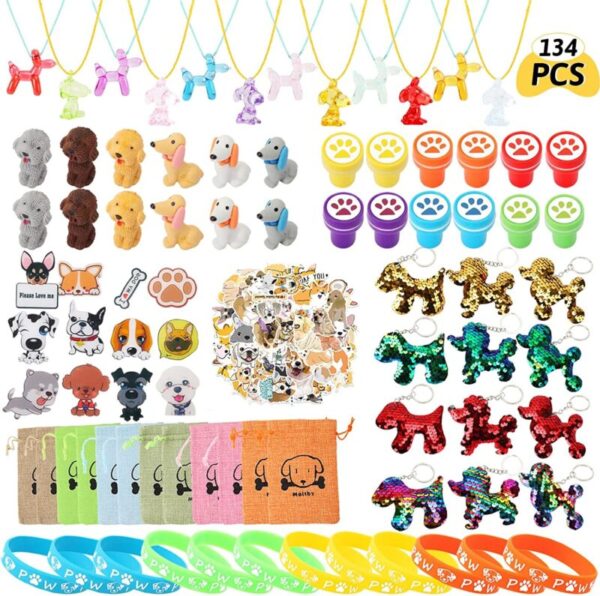 134Pcs Dog Paw Party Favours Set – Dog Paw Print Bracelet Necklace Keychain Brooch Sticker Erasers Puppy Gift Bag for Kids Boys Girls Birthday Goodie Bags Animal Theme Supplies